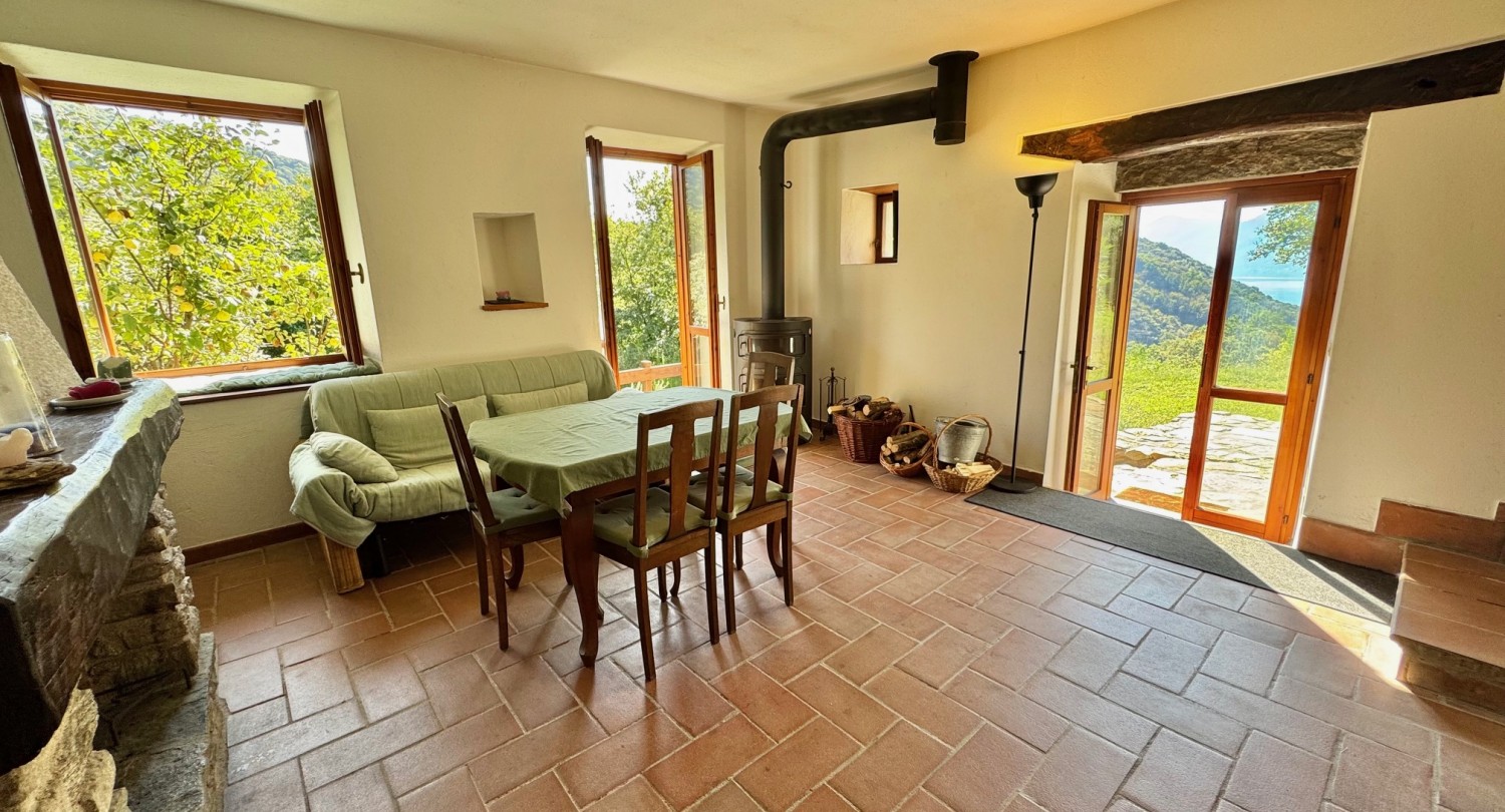 Haus in Dumenza. Dieses wunderschöne Naturstein-Rustico befindet sich in der Gemeinde von Dumenza, im Ortsteil Vigana, oberhalb von Colmegna, in reiner Südlage mit einem atemberaubenden Blick auf den Lago Maggiore. Das Rustico hat eine Wohnnutzfläche von ca. 187 qm und ist wie folgt aufgeteilt: EG: heller Wohn-/Essbereich mit offenem Kamin und direktem Zugang auf die Terrasse, Wohnküche, 1 Schlafzimmer und der Technikraum. OG: 2 Schlafzimmer mit Ausgang auf den Balkon und ein Badezimmer mit Dusche und Fenster. Das Grundstück hat eine Größe von ca. 3.930 qm. Mehrere Stellplätze auf dem Grundstück und ein Kellerraum runden dieses Angebot ab. Die laufenden Kosten sind sehr gering, da der Strom und Warmwasser über eine PV-Anlage mit Wärmepumpe und Solarthermie erzeugt werden und der eigene Wald genug Brennholz bietet.