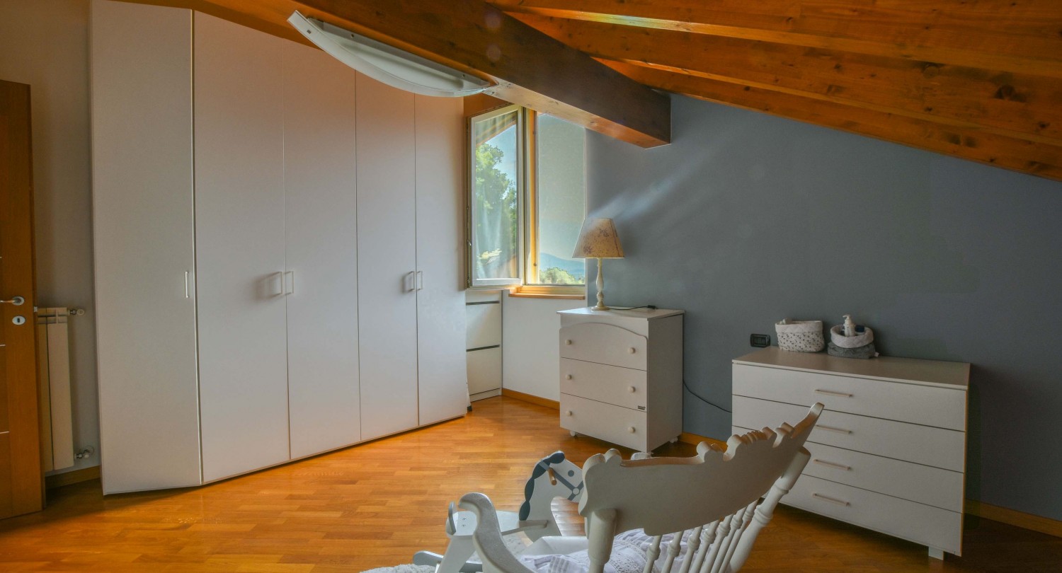 Die Wohnung befindet sich im ersten Stock, ist über eine Außentreppe erreichbar und erstreckt sich über eine Fläche von ca. 160 Quadratmetern auf zwei Ebenen: Im ersten Stock befinden sich ein großes Wohnzimmer mit direktem Zugang zur Terrasse mit Blick auf den See und einem thermoventilierten Kamin, eine offene Küche, ein Schlafzimmer und ein Badezimmer mit Dusche. Im zweiten Stock befinden sich zwei Schlafzimmer und ein Badezimmer mit Badewanne und Dusche. Die Böden sind aus Holz.Zur Immobilie gehören eine große Garage, ein privater Außenparkplatz und Zugang zu exklusiven Gemeinschaftsbereichen wie dem Swimmingpool und dem Park. Die Wohnung verfügt außerdem über eine Taverne und eine Waschküche im Untergeschoss.