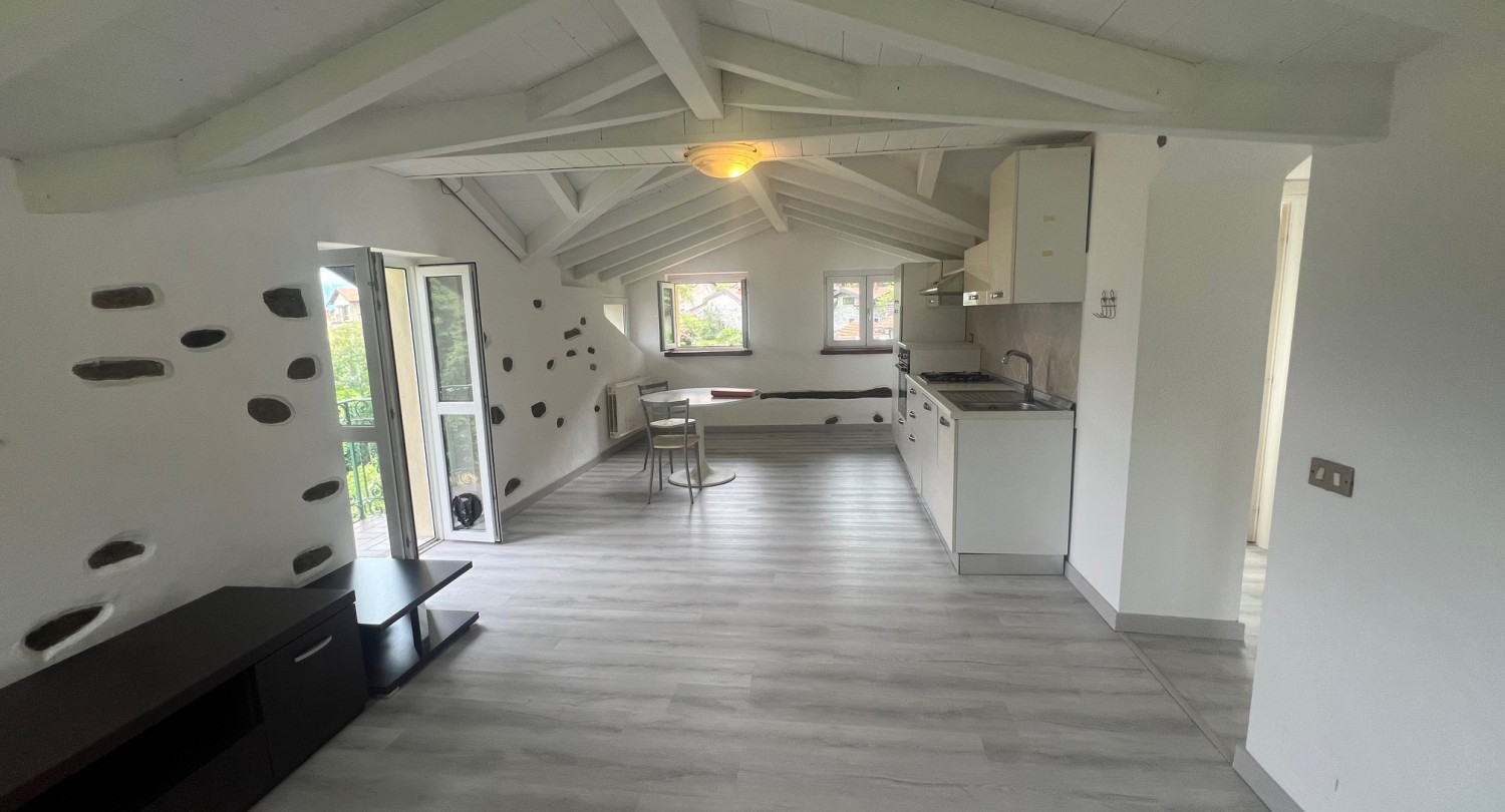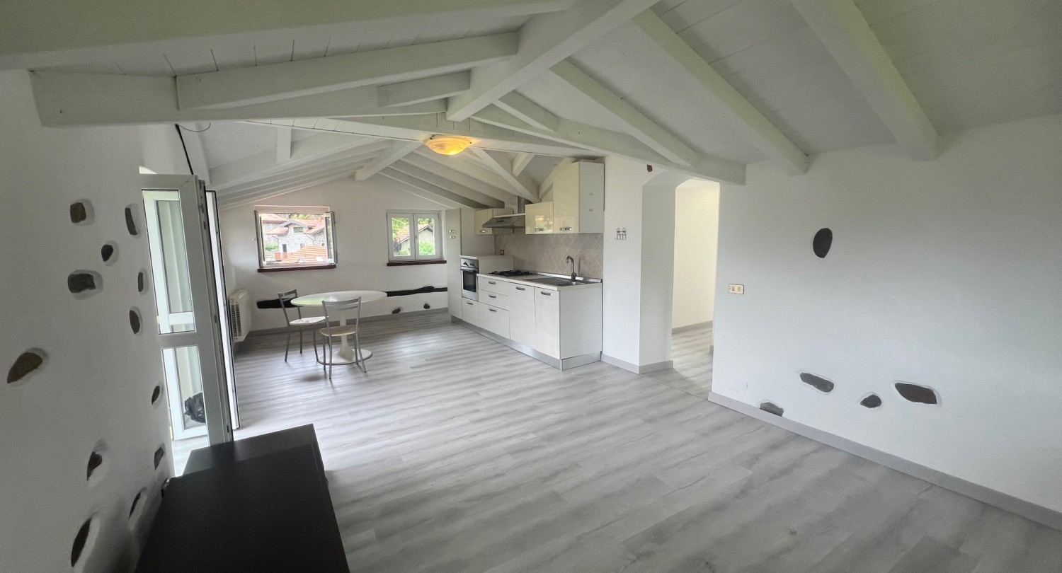 Attico: Appartamento III - soggiorno con cucina aperta, una camera matrimoniale, 1 camera singola, bagno, balcone, una terrazza e un ampio terreno boscoso.