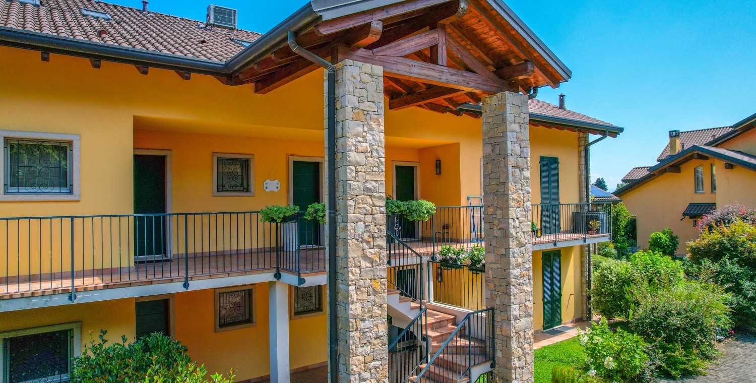 Die Wohnung befindet sich im ersten Stock, ist über eine Außentreppe erreichbar und erstreckt sich über eine Fläche von ca. 160 Quadratmetern auf zwei Ebenen: Im ersten Stock befinden sich ein großes Wohnzimmer mit direktem Zugang zur Terrasse mit Blick auf den See und einem thermoventilierten Kamin, eine offene Küche, ein Schlafzimmer und ein Badezimmer mit Dusche. Im zweiten Stock befinden sich zwei Schlafzimmer und ein Badezimmer mit Badewanne und Dusche. Die Böden sind aus Holz.Zur Immobilie gehören eine große Garage, ein privater Außenparkplatz und Zugang zu exklusiven Gemeinschaftsbereichen wie dem Swimmingpool und dem Park. Die Wohnung verfügt außerdem über eine Taverne und eine Waschküche im Untergeschoss.