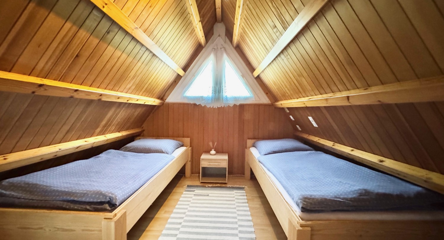 Piano superiore: zona notte con 4 posti letto. Il giardino ha una superficie di circa 370 mq.